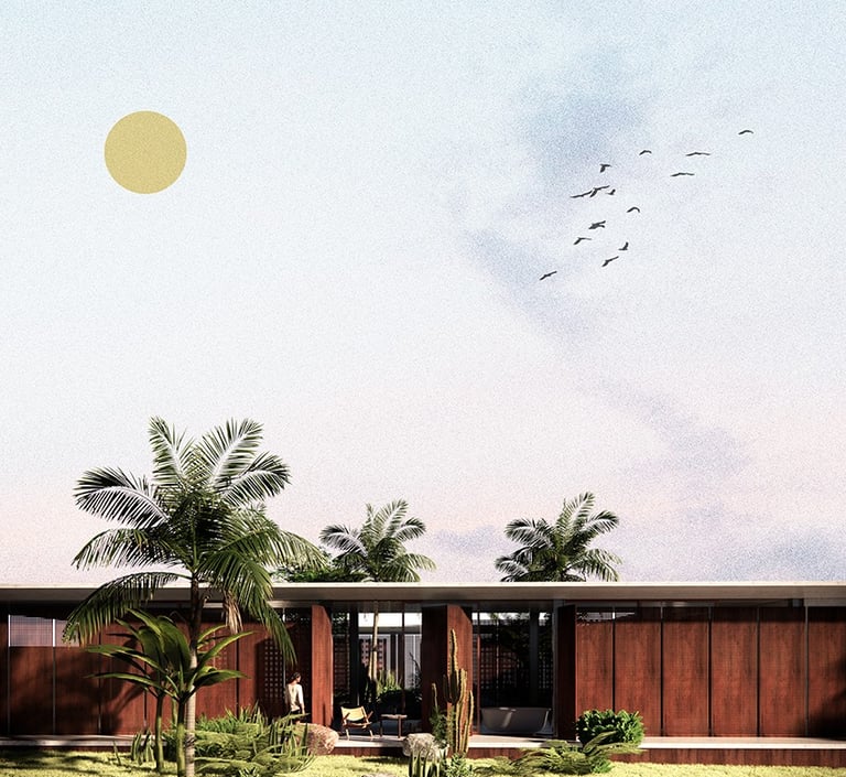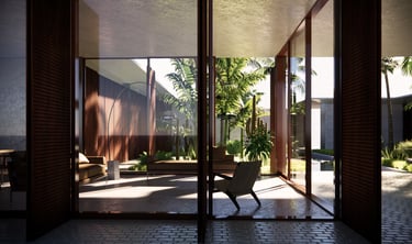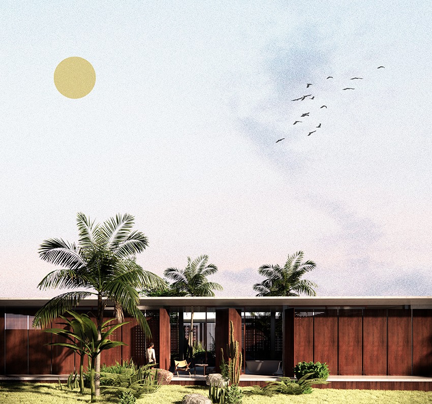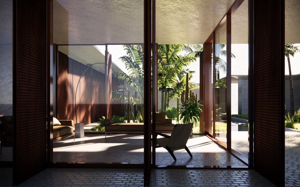 "Living spaces spill out into lush courtyards and gardens that form a threshhold and blurred interface between insde and outside."